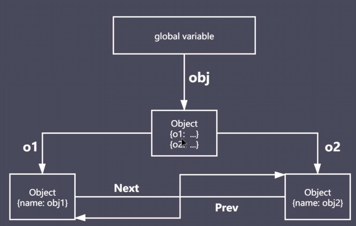 delete obj.o1 // 断掉obj到o1空间的引用,通过断掉ojb2通过prev对o1空间的引用